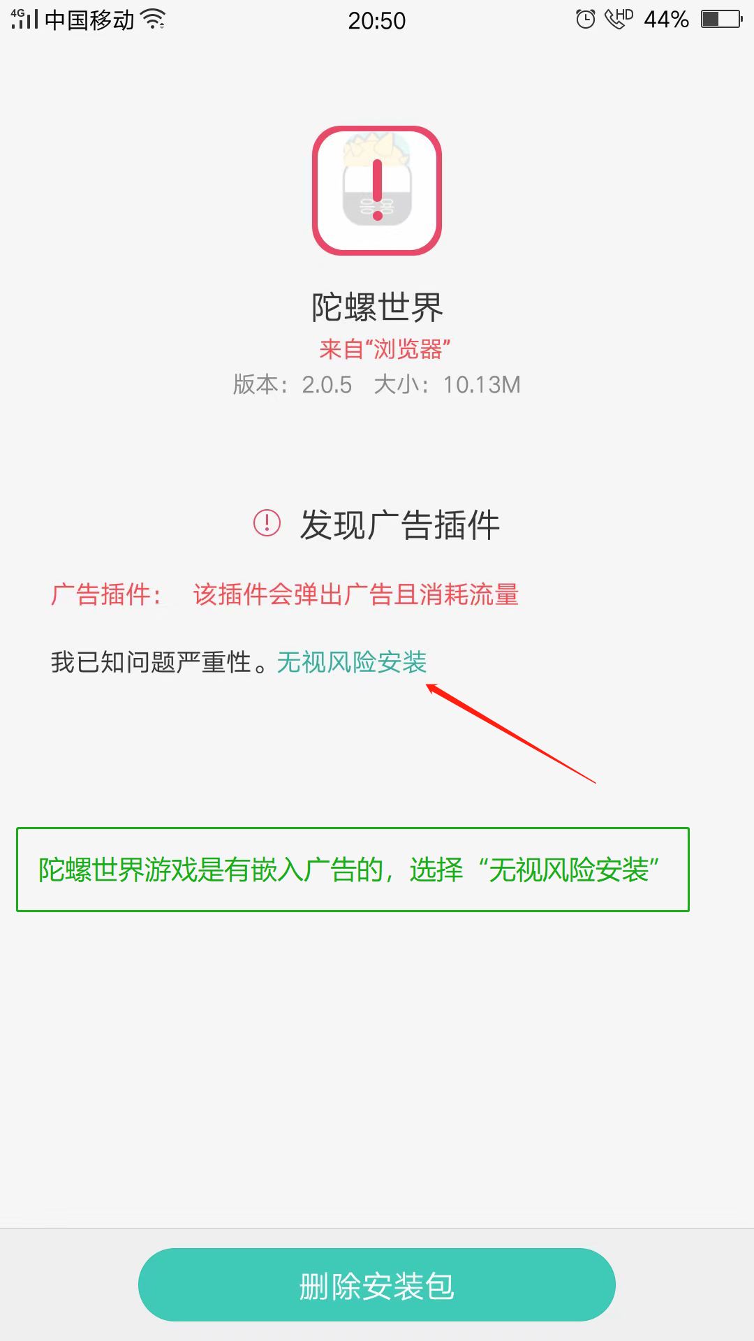 如Android手机 OPPO R9S,在安装的时候提示可能装了过滤插件的软件,因此会出现相关的提示。请您无需担心,陀螺世界是一款绿色健康,无充值入口的绿色安全无风险APP,因此请选择-无视风险安装即可。谢谢您的支持!