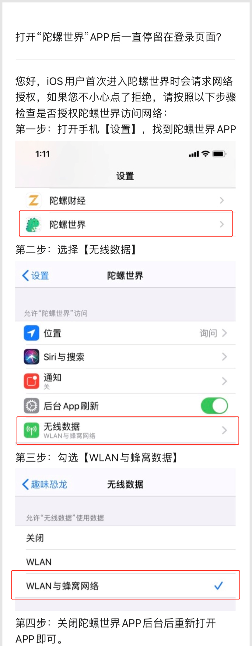 您好,iOS用户首次进入陀螺世界时会请求网络授权,如果您不小心点了拒绝,请按照以下步骤检查是否授权陀螺世界访问网络: